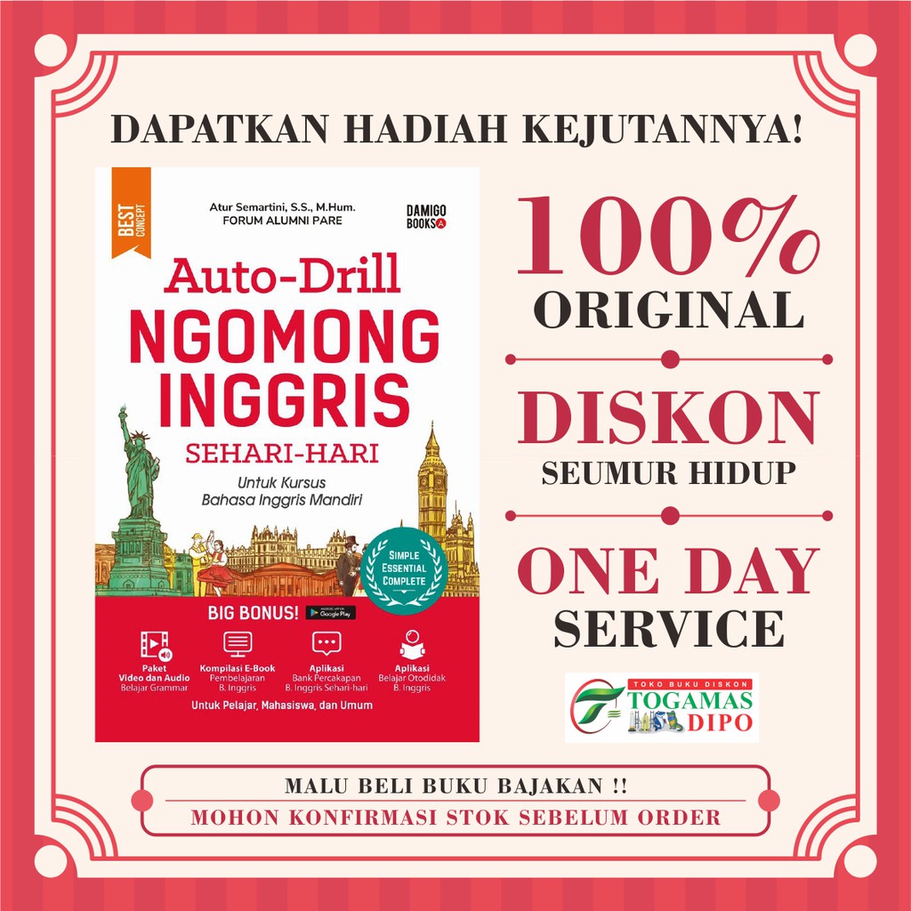 Produk AUTO-DRILL NGOMONG INGGRIS SEHARI-HARI UNTUK KURSUS BAHASA INGGRIS MANDIRI ini harganya adalah Rp. 54.000,00 dan saat ini sedang Diskon 10%, Produk ini sendiri saat saya tulis Artikel ini sudah dilihat sebanyak 3 kali dan sudah disukai sebanyak 4 kali.